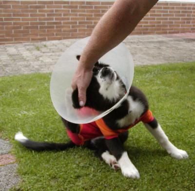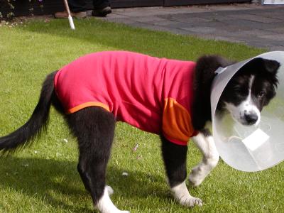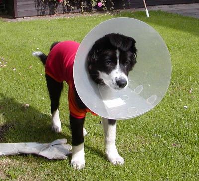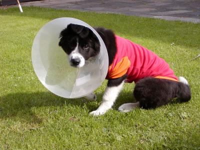 Bei einem so kleinen Wirbelwind wie es Emily war, ist es allerdings nicht ganz unproblematisch verlaufen denn nur an der Leine laufen, nicht springen, kein spielen mit dem Bällchen …. das fand Emily überhaupt nicht gut und so kam es natürlich das ihre Narbe auch wieder aufging und sie musste diesen Trichter über 4 Wochen tragen. Aber sie sah wirklich süß aus.